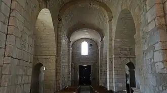 Les murs gouttereaux de la nef seraient des remplois. Le reste de l'église aurait été construit d'une manière non continue mais sur une période assez brève en allant de l'ouest vers l'est. Le mur gouttereau sud en petit appareil serait le plus ancien. Il est percé d'une fenêtre romane de faibles dimensions située aux deux tiers de la hauteur. Il est probable qu'au XIe siècle l'église était simplement charpentée. Quand, au XIIe siècle, il a été prévu de couvrir la nef avec une voûte en berceau, on a choisi de rétrécir la portée à un peu moins de huit mètres en montant trois puissants murs-diaphragmes dont deux sont percés d'un passage étroit en plein cintre, en reprenant une disposition utilisée en Angoumois et en Saintonge. La nef est divisée en trois travées séparées par deux arcs-doubleaux situés au droit des murs-diaphragmes. La voûte en berceau s'appuie sur des voûtes longitudinales entre les murs-diaphragmes.