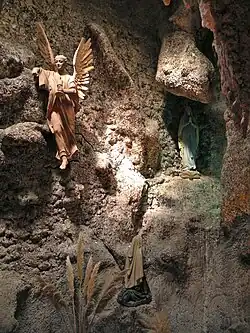 Dans la même chapelle, deux tableaux de faïence flanquent l'autel de la Vierge. Celui de gauche représente le miracle des roses, à savoir sainte Élisabeth de Hongrie étant surprise par son mari en train de distribuer du pain aux pauvres, pain transformé instantanément en roses afin de calmer la fureur de Louis IV de Thuringe. Le tableau de droite représente la Présentation de Marie au Temple. Les cartons sont de Charles Lévêque (1820-1889), vitrailliste à Beauvais. Les carreaux ont été confectionnés par la faïencerie de Choisy-le-Roi[33]. Quant à l'autel de la Vierge lui-même, il s'agit d'une création néo-gothique sans prétention, certainement achetée sur catalogue, dont les quatre statuettes ont été retirées de leurs socles de part et d'autre du bas-relief de la Vierge à l'Enfant, et placées à côté du tabernacle. Dans la chapelle Saint-Joseph, de l'autre côté du sanctuaire, l'autel est tout au contraire d'un style égyptisant exubérant, et repose sur deux sphinges. À leurs côtés, des serpents enroulés sur eux-mêmes formant volutes sont suspendus sous la table. Deux pilastres ornés de candélabres, dont l'un arbore une tête d'homme en profil (l'abbé Barret ?), encadrent un bas-relief ajouré représentant la Nativité, où les rinceaux végétaux attirent davantage l'attention que le sujet lui-même. La qualité du meuble en terre cuite n'est pas à la hauteur de l'ambition. Il se disloque de toutes parts, et ses éléments tombent en morceaux tout seuls. Du retable, ne subsiste plus qu'un fragment, en même temps son composant principal, à savoir un petit bas-relief représentant la mort de saint Joseph, en compagnie de la Vierge Marie agenouillée à côté de son lit, et de Jésus qui lui accorde la bénédiction tout en lui tenant la main, tandis que l'ange de la mort s'apprête à lui lancer sa flèche. Plusieurs statues et bas-reliefs ont déjà disparu[35], et le maître-autel, sans doute incompatible avec une célébration eucharistique centré sur le sacrifice du Christ, a été démantelé.