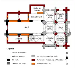 | Autres campagnes de travaux | 1505 (charpente de la nef) ; 1586 (chapelles latérales) ; 1877-1893 (décor de la nef, grotte de Lourdes, fausses voûtes du bas-côté sud) ; 2005 (toiture unique de la nef) |