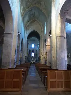 La grande nef ne devait pas être voûtée à l'origine : elle a reçu tardivement un berceau brisé sur doubleau. Les collatéraux sont voûtés avec des demi-berceaux.