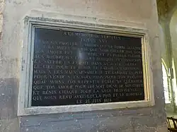 - Plaque en marbre noir en l'honneur de Louis XVI, rédigée peu après le retour de Louis XVIII à Paris (), restée en place malgré le retour de Napoléon 1er ()[8]. Cette plaque est apposée sur un pilier du côté gauche de la nef.
