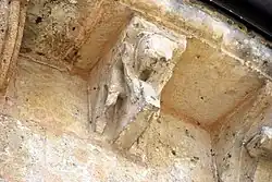 Les modillons romans sont sous la corniche, entre les colonnes de la façade est du chevet.