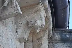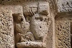 - Le deuxième chapiteau montre trois masques. Celui du milieu est un diablotin à oreilles pointues et gros yeux qui ouvre sa gueule avec la lippe ou la langue pendante. Les deux masques latéraux conservent une physionomie plus humaine, malgré la grimace qu'ils esquissent. Peut-être les victimes du diable ?