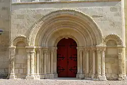 La porte s'ouvre sous cinq arcs en plein cintre et est accompagnée, de chaque côté, en retrait, d'une porte feinte de même forme. Les arcs ont pour tout ornement des tores, des dents de loup et quelques arabesques.