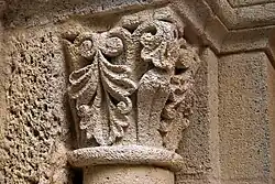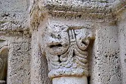 - le deuxième chapiteau montre un masque humain, caricaturant un chanteur au visage gonflé, mais un peu effacé, qui émerge entre deux palmettes ;