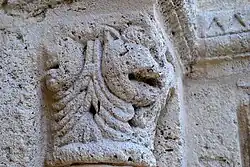 Le plus étroit des arcs qui recouvre la porte retombe sur les piédroits que l'on a dégradés à une époque ancienne. Avant la restauration de 1860, sur la clé de cette petite voussure, on pouvait voir une main bénissant à la manière latine, entourée d'une auréole. Les deux colonnes, les chapiteaux et l'arc ont été remplacés et datent de 1863.