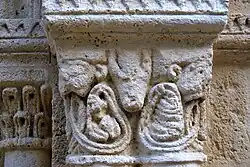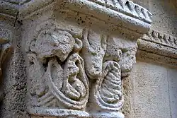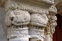 - le quatrième est un double chapiteau. La corbeille montre des masques démoniaques, avec ridules faciales, dents de fauve, oreilles animales, cheveux flammés, yeux globuleux ;