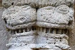 Ce sont des engoulants et ils symboliseraient l’entrée du Léviathan dont la bouche doit être bouchée, le plus souvent, par un bout de l’édifice. Ici, c'est la double colonne qui les bouche.
