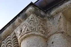 Les bas des colonnes s'appuient sur des socles carrés. Les parties supérieures des chapiteaux sont ornées de dents de loup et les tailloirs formés de moulures presque classiques.