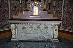 L'absidiole de droite, de teinte dominante bleue, est dédiée à saint Joseph. Le bas-relief sur l'autel représente la Cène.
