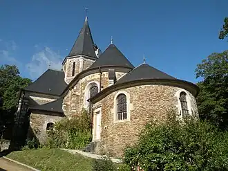 La tour située à la croisée du transept est octogonale et pourvue en son sommet d'une pyramide couverte d'ardoises. « Les murs sont en briques et en pierres de taille »[2].