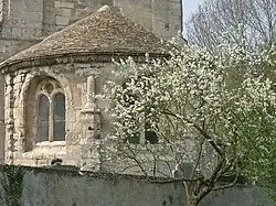 L‘abside semi-circulaire, éclairée par trois baies à fenêtres géminées, se distingue par une couverture de lauzes, détail rare dans l‘Aisne.