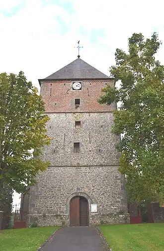 L'église Saint-Martin est protégée par un imposant donjon à base carré de 8 m de côté surmonté d'un toit à quatre pans en ardoise. Trois niveaux de construction sont bien délimités : les deux niveaux inférieurs en granit grossier et la partie supérieure en brique. Les deux niveaux supérieurs sont eux-mêmes divisés chacun en deux étages avec une porte centrale et des meurtrières (la porte du haut a été remplacée par l'horloge).
