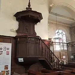 - Lambris de la nef et du transept sud, tribune, tambour de la porte occidentale et banc d’œuvre datant des XVIIe siècle et XIXe siècle[9]