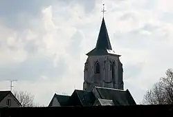 La tour carrée du clocher a sa silhouette épaissie par la présence à chaque angle de deux contreforts, dont la décoration supérieure consiste en un éperon surmonté par un pinacle appliqué sous un talus (biseau). Quatre larmiers tronçonnent la hauteur de la tour, pour en rompre la monotonie, en autant d'étages dont le dernier est percé sur chaque côté par une grande et haute baie à archivolte et ayant perdu le meneau qui la géminait.