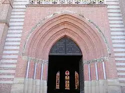 Avant la Révolution, l'église était une dépendance et une succursale de celle de Saint-Sernin de Toulouse. Le portail du XIIIe siècle a été déposé et six colonnettes et les chapiteaux sculptés remontés dans le mur en briques de la nouvelle église. Il se compose d'une série d'arcs en briques et d'une pierre servant d'encadrement. Les chapiteaux des colonnes, colonnettes et pilastres supportant ces arcs, forment une ligne de sculpture horizontale en continu[6]. Le portail a été inscrit au titre des monuments historiques en 1950, et plusieurs objets sont référencés dans la base Palissy[6].