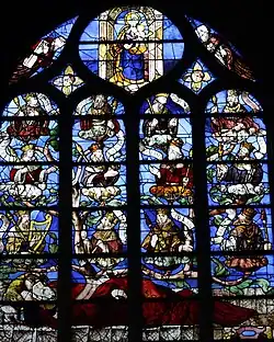 - Vitrail de saint Martin, 3e travée du collatéral sud du chœur : Il se compose pour l'essentiel de trois fragments d'un vitrail narrant la vie de saint-Martin, traité surtout à la grisaille et au jaune d'argent. L'on distingue l'apparition du Christ à saint Martin ; la chute du pin sacré et la messe miraculeuse. D'un ou deux autres vitraux, proviennent une Adoration des mages et la figure très recomposée d'un donateur[27].