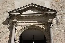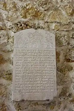 - Une plaque commémorative avec une inscription dédicatoire et l'année 1549 commémore la consécration de l'église au XVIe siècle. Des représentations en relief sont gravées dans la partie supérieure de la dalle de pierre. A gauche se trouve Saint Roch de Montpellier avec un chien à ses pieds et un ange soignant ses plaies, au milieu Saint Martin partageant son manteau avec un mendiant, et à droite Saint Sébastien, qui, attaché à un arbre, se faisant transpercer par flèches[3].