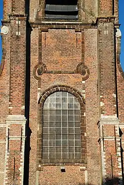 L'église présente une façade édifiée en briques rouges et rehaussée d'éléments en grès ferrugineux et en grès blanc.