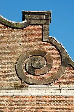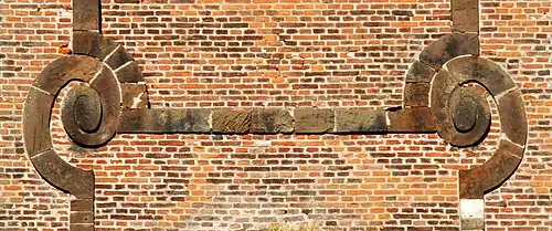 Les parties latérales de la façade sont segmentées verticalement par des bandes et des cordons de grès blanc et surmontées par d'impressionnantes volutes de grès ferrugineux qui forment comme un pignon encadrant et supportant le clocher. Elles sont ornées par de grands cartouches de grès blanc constitués d'un rectangle segmenté par un arc surbaissé, le tout surmonté d'un ovale.