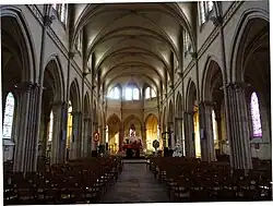 L'église de style néo-gothique comporte une nef de sept travées flanquée de bas-côtés, qui se prolonge, sans transept, par le chœur de trois travées surélevé d'une marche, également avec bas-côtés, terminé par une abside polygonale à trois pans avec déambulatoire. Ce dernier sépare le chœur des trois chapelles absidales rayonnantes, celle du centre est consacrée à la Vierge Marie, celle de gauche à Saint Joseph, et celle de droite au Sacré-Cœur de Jésus.