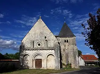 La façade de l'église comporte trois portails, dont deux sont murés. La baie centrale, dénuée de tympan, comporte trois voussures formées de claveaux qui reposent sur deux chapiteaux décorés. Sur le chapiteau nord, des têtes de chats sont visibles[2] dont la mâchoire serre des tiges de palmettes stylisées ; au-dessous, un lacet retient d'autres palmettes dont l'extrémité descend jusque sur l'astragale : c'est, d'après François Deshoulières[2], une formule typiquement berrichonne.