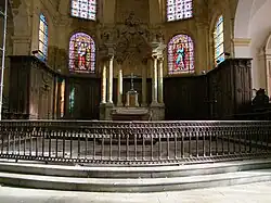Le chœur sera ici considéré du point de vue de l'usage liturgique et non du point de vue architectural. Cette partie comprend donc la dernière travée et le chœur lui-même, à chevet pentagonal. Comme on l'a vu précédemment, celui-ci est muni de cinq baies, réparties sur les deux registres supérieurs. La lumière abondante que les vitraux donnent à cette partie de l'église, contraste avec la pénombre de la nef.