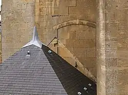 En 1974, on entreprend des travaux de plus grande ampleur. Il est décidé de consolider le perron ouest mais surtout la voute de la nef. Pour ce faire, l'architecte Jean Rocard construit des arcs-boutants dans les combles des bas-côtés[13]. Les contreforts deviennent alors les culées de ces arcs dissimulés sous la toiture. À cette époque, la couverture des deux tours est réparée et leur charpente renforcée.