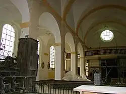 Le jubé en bois s'étend sur toute la largeur de l'église, dans la première travée. Son profil curviligne est plus large dans le vaisseau principal que dans les collatéraux. La partie en surplomb est soutenue par deux piliers en bois dont la polychromie imite les nervures du marbre. Deux piliers semblables sont accolés au mur ouest, de part et d'autre du tambour central. Ces piliers sont juxtaposés à des piliers identiques à ceux qui se trouvent entre les baies.