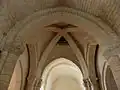 L'abside demi-circulaire, voûtée en cul-de-four, est éclairée par cinq fenêtres romanes à colonnettes.