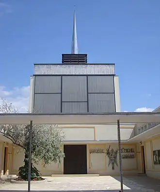 C'est un bâtiment de structure moderne, utilisant des matériaux de construction tels que le béton ou le métal, et fait d'un patio et d'un corps de bâtiment cubique supportant un clocher ramené à des abat-son et une flèche relativement courte[5]. La lumière est amenée à l'intérieur du bâtiment par des parois en polyester transparent, dont la décoration a été réalisée par le verrier François Chapuis[6].