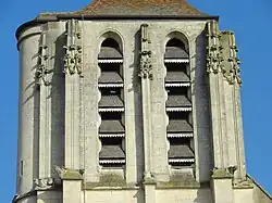 La tourelle d'escalier est éclairée par de petites ouvertures rectangulaires, mais le premier et le deuxième étage intermédiaire sont sinon aveugles. L'étage de beffroi est bien sûr moins austère, et une chimère est disposée sur le larmier à gauche et à droite de chacun des contreforts d'angle. De même, les contreforts d'angle s'amortissent par des pinacles géminés, et les contreforts médians par des pinacles simples. Les baies ne sont en revanche par décorées, mais seulement entourées du tore et de la gorge que l'on note déjà sur les baies du rez-de-chaussée. Elles sont presque en plein cintre, et donc nettement moins aigües que les baies de la base. La corniche fait défaut, et le clocher se termine de manière assez abrupte par un toit à la hache surbaissé, ce qui justifie que les auteurs le considèrent comme inachevé[5].