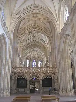 L'église de Brou est régie par l'idée du passage. Ce sentiment est particulièrement évident lorsqu'on passe sous l'arc triomphal du jubé, nous conduisant de la nef, blanche et épurée, au chœur, richement doté et éclatant de couleur, avec ses vitraux, ses stalles, ses tombeaux en noir et blanc. Il faut imaginer, en plus, au XVIe siècle, un pavement émaillé multicolore[2],[3].