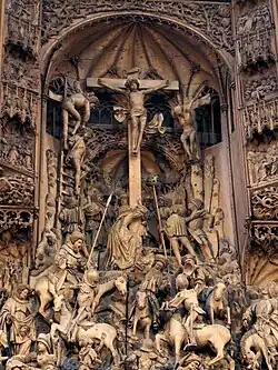 Le retable sculpté donne à voir une superposition et un enchevêtrement d'un très grand nombre de scènes petites et grandes autour de la vie et de la Passion de Jésus avec, comme couronnement, la scène de la crucifixion dans le haut de la partie centrale. On peut observer que le retable est composé de morceaux sculptés individuellement puis assemblés; avec le temps, cette composition apparaît plus clairement. La peinture des panneaux, d'usage à l’époque, aurait caché les coupures, mais les panneaux n'ont pas été peints, soit par manque d'argent, soit parce que les goûts avaient évolué[2].