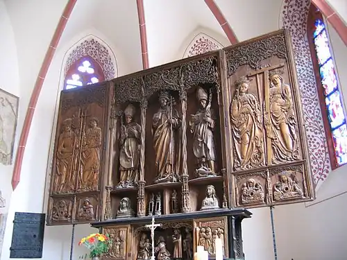 Lorsque le retable est ouvert, on peut voir les représentations en grandeur nature de plusieurs personnages sculptés en bas relief (de gauche à droite): Bernard II de Bade, Philippe l'Apôtre, saint Nicolas, le pape Grégoire le Grand, saint Valentin, sainte Catherine et sainte Hélène. En dessous d'eux se trouvent une série de bustes reliquaires. De gauche à droite, saint Sébastien, saint Étienne, sainte Félicité et une sainte inconnue. Entre ces quatre reliquaires sont disposés d'autres reliquaires consacrés à sainte Lucie, sainte Anne et sainte Marguerite. La prédelle qui provient manifestement d'un autre atelier montre l'Adoration des Mages flanqué de l'Annonciation (gauche) et de la Visitation (droite).