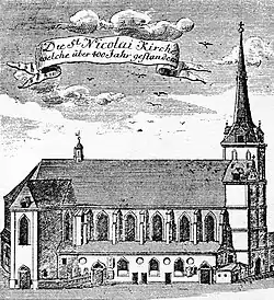 L'église Saint-Nicolas vue depuis la tour du Rotes Rathaus. | ||