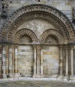 Le recours simultané aux deux formes d'agencement (radial et tangentiel) des figures témoigne d'une étroite parenté avec le portail occidental de l'église Saint-Pierre d'Aulnay. Ce dernier servit, en effet, de modèle pour de nombreux portails du Poitou et de la Saintonge.