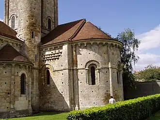 L'abside et les absidioles sont très décorées. Une frise de pointes-de-diamant se développe tout autour de l'abside au niveau des arcs des trois baies. Celles-ci sont encadrées de colonnettes et ornées de billettes, de losanges, de cylindres en bout.