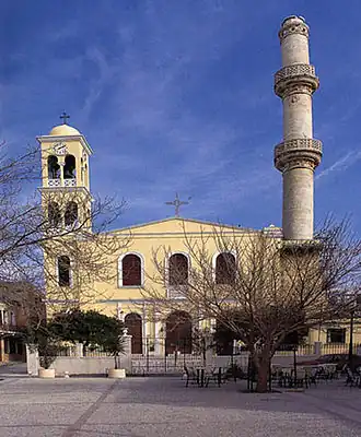 Le minaret n'a pas été démoli lors de la conversion de l'édifice en église orthodoxe grecque en 1918[4]. Restauré entre 1998 et 2000 à la suite de dégâts causés par la foudre, il n'a aujourd'hui plus de toit conique et ne mesure donc que 34 mètres de haut. En 1950, un clocher de l'église a été reconstruit de façon moderne[3].