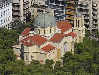 L'église est située dans la partie orientale du centre-ville d'Athènes, plus précisément au niveau de la rue Asklipioú, à proximité de la colline du Lycabette. Elle est de forme cruciforme et possède un dôme de grande taille, ainsi que deux clochers[1],[2].