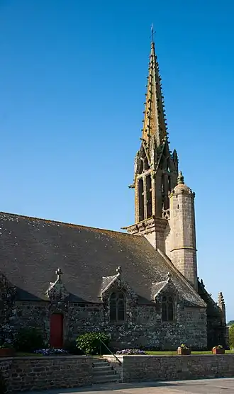Elle comprend une nef avec bas-côtés de cinq travées terminée par un chevet polygonal. Deux chapelles en aile forment faux transept ; celle du sud est partagée en deux par deux arcades et une architrave. Le chevet a son fenestrage du xvi" ; et près de la porte du porche, à l'intérieur, on lit l'inscription : « 1. PARIS. FAB. 1581. » La façade ouest est de la même famille que Plouhinec, Confort, Saint-Tugen, Cléden, Plogoff avec porte en anse de panier dans un arc ogival. Le clocher, d'une grande élégance, ne porte pas de galerie. Les voussures des grandes arcades pénètrent directement dans les piliers. Le porche sud, voûté sur arcs ogives très bombés, avec liernes longitudinale et transversale, porte l'inscription : « LAN : 1611 : GONIDEC. FAB. 1612 : H : JOURDIN : FUT : FAB : 1618 : N : BRÏGNON : 1623 » ; sous le linteau, 1617. Au-dessus de l'une des fenètres sud : « SIMON GUILLOU FAB. 1662. » "[3]