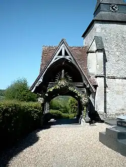 - Le deuxième, celui qui adhère au portail même de l'église, a des poutres sculptées de délicates torsades.