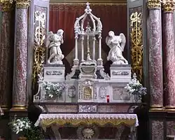 Le tabernacle et le ciborium sont en marbre blanc et rose.