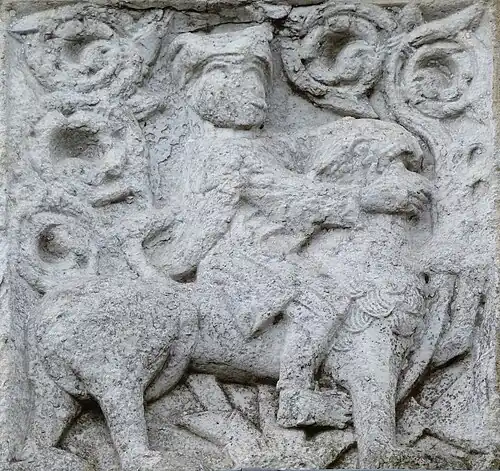 Le deuxième bas-relief qui serait mis en avant est donc le 8e. A l’image du graphisme de ce chiffre, il se compose de deux éléments superposés : un homme et un animal. La queue du lion atteint le dos de l’homme (sinon, elle serait perdue au milieu des volutes) et la main de l’homme la gueule du lion. Ces deux éléments sont liés et forment un tout qui s’inscrit au centre d’une plante portant des crosses, c’est-à-dire des éléments qui peuvent s’enrouler ou se déployer. A l’image du lotus sacré qui symboliserait la réalisation spirituelle, l’épanouissement de la vie et de l’intelligence, cette plante symboliserait cette même réalisation au travers de ce qu’elle représente : « le triomphe de l’homme sur l’animal ». Il s'agit ici de la lutte entre Samson et le lion (que l'on rencontre régulièrement dans l'art roman et bien moins par la suite).