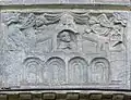 Ce premier bas-relief montrerait au travers d’une représentation ce qui est important et désirable : trois livres sont présentés ici, trois livres qui permettraient d’accéder à la connaissance spirituelle de ceux qui les portent. L’artiste a pu vouloir exprimer l'importance de ces livres en mettant en avant ou en valeur ceux qui les portent.