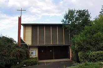 La structure de sa nef est une halle métallique, construite sur un socle de béton, où sont les locaux paroissiaux[4]. Une croix en acier rouge est à l'entrée de l'église[4].