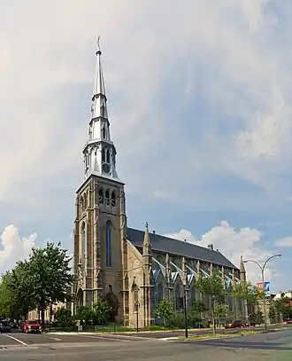Le portail est orné d'une statue de saint Pierre et est surmonté d'une flèche de 71,6 m, une des plus hautes à Montréal.