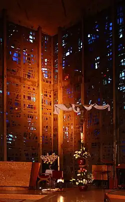 L’église a été construite par l’architecte Jean Hebrard. L'auteur des vitraux est le peintre-verrier Louis-René Petit.[réf. nécessaire]. La construction de cette nef en forme de losange, de 29 mètres de côté, fait appel exclusivement à la technique du béton armé[3]. L’intérieur du bâtiment est marqué par l'absence totale de segmentation physique de l’espace telle qu’elle existe dans les églises traditionnelles, l’autel est un bloc massif de marbre rouge de 3 tonnes. Autant d’éléments architecturaux novateurs pour l’époque et qui rendent cet édifice d’une capacité de 1 400 personnes, hors normes.