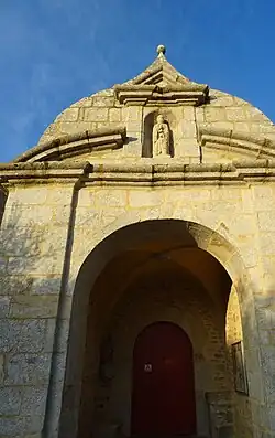 L'entrée se fait par la porte sud et dans le porche se trouve un bénitier à pan coupé, orné d'une rosace et de deux torsades. Ce bénitier, qui porte la date de 1629[1], se trouvait autrefois à l'extérieur et était encastré dans le mur[5].