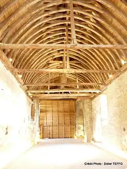 Une partie plus ancienne de la charpente, du XIIIe siècle, est située au-devant des transepts, avec trois tirants plus importants, et des murs renforcés extérieurement par des contreforts. Cette partie de la nef accueillait le clocher, démoli en 1885. Les traces de passage des cordes, et des découpes à la hache pour faire passer les cloches sont encore visibles sur les fermes.